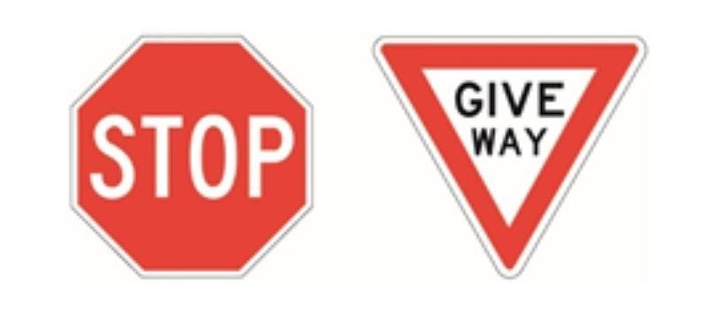 Whenever you see these signs, you must always follow them. Stop when you see this red and white stop sign and give way to other vehicles when you see this Triangular sign with 'Give Way' written on it.